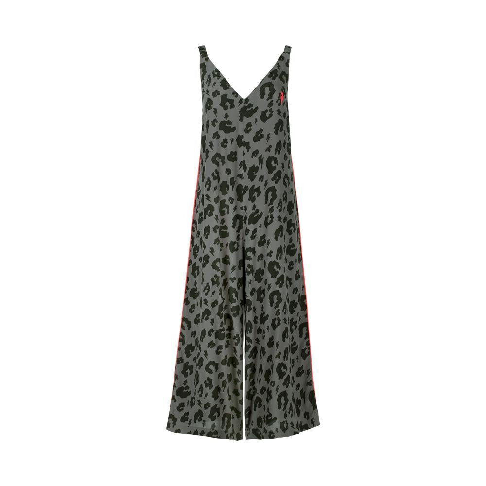 Grey leopard and lightning bolt print jumpsuit with Scamp & Dude's signature neon piping on the side seams.