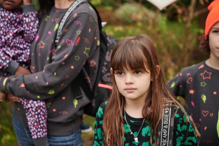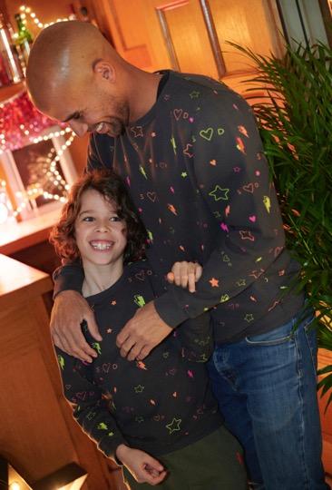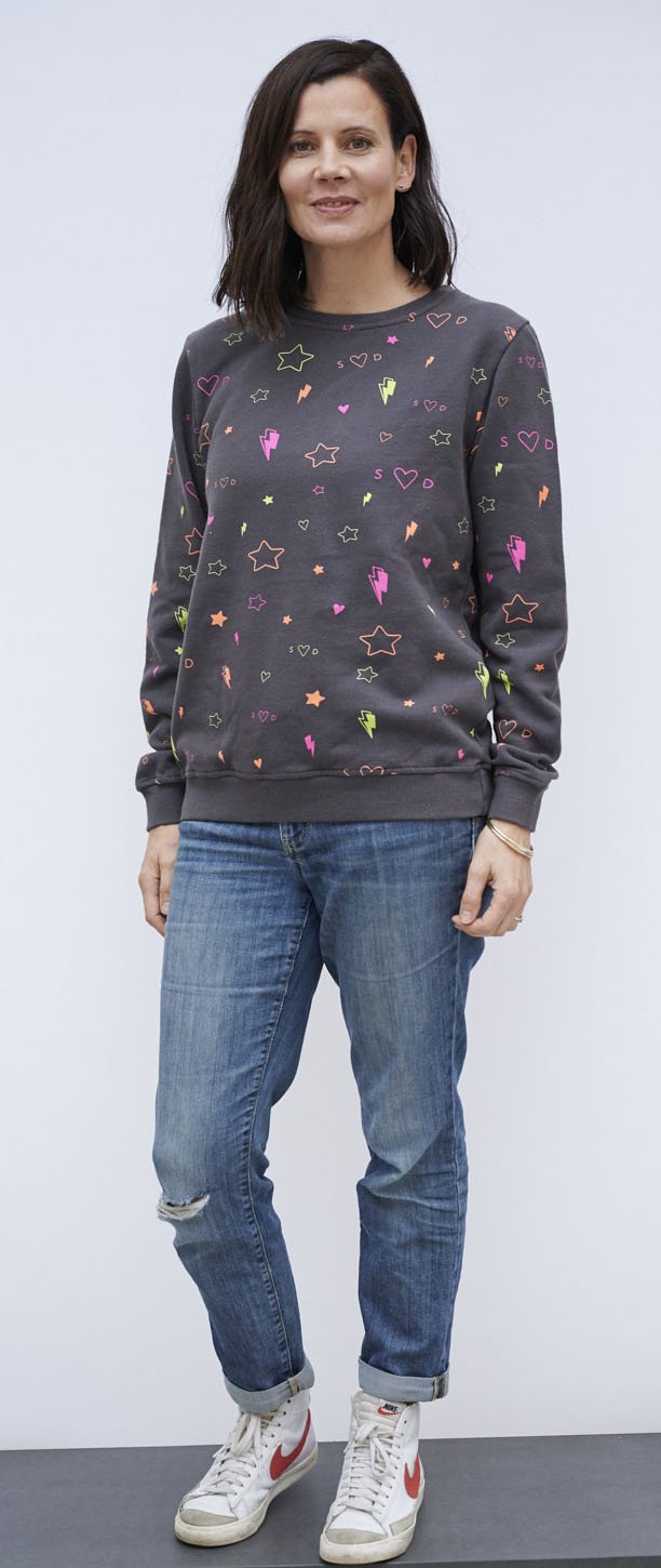 Dark grey super soft sweatshirt with neon hearts, stars and lightning bolt print and Scamp & Dude's new special ‘Army of Love’ logo.
